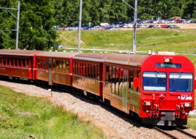 Al vroeg rijdt de Bernina Express als een trammetje door de straten van Chur. Via St. Moritz klimt het rode bergtreintje naar een pashoogte van 2.253 meter, maar de trein rammelt onverstoorbaar door. Na de pashoogte dalen we af. Net op tijd hebben we de camera scherp gesteld voor weer een fotomoment wanneer de Bernina Express de keerlus draait onderweg naar Tirano, het eindstation van deze adembenemende treinreis. Per touringcar reizen we over de Berninapas weer terug naar Oostenrijk.